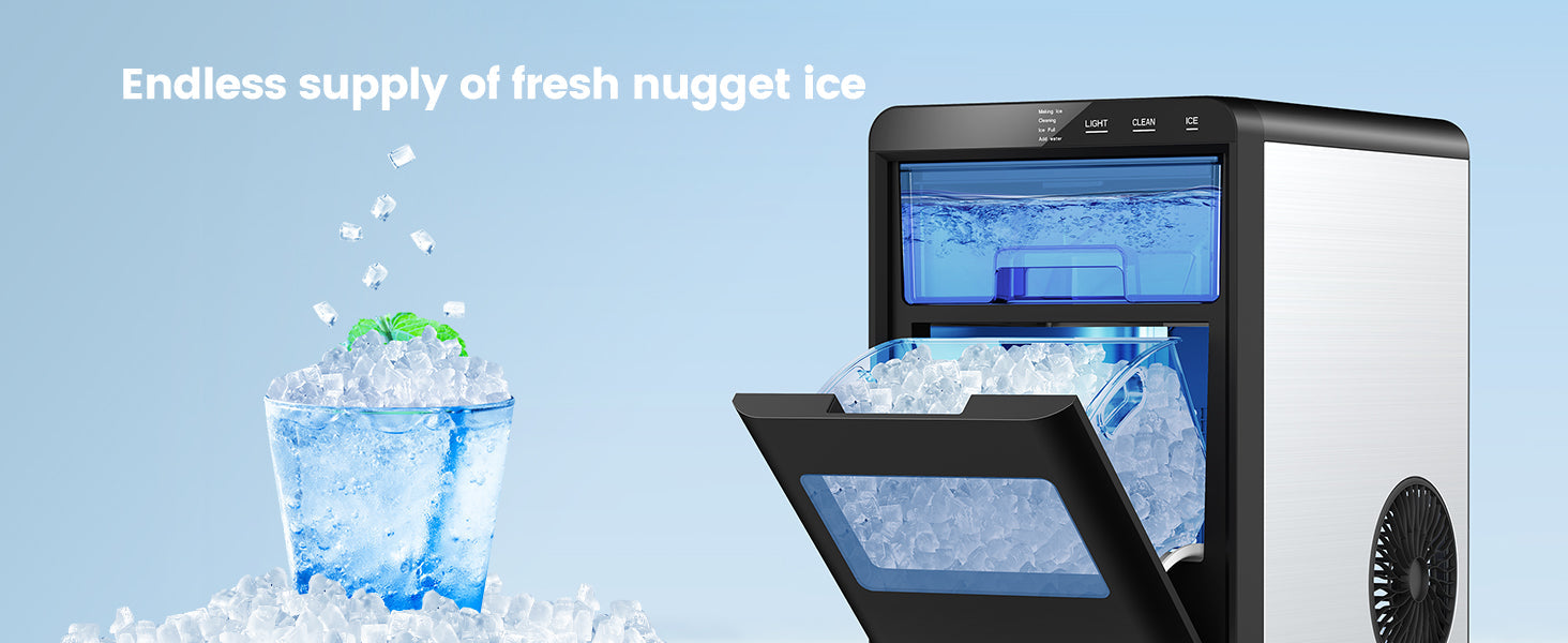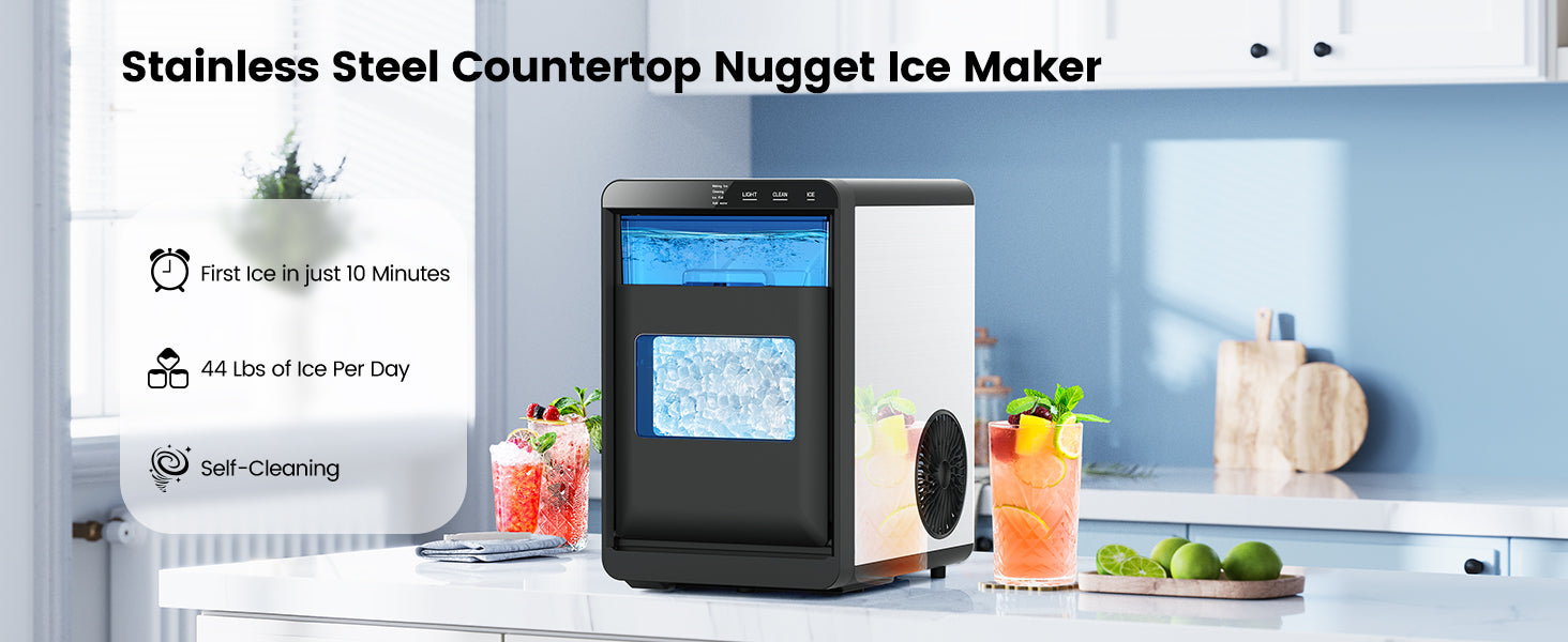 - 【Continuous Ice Supply】:pebble ice maker creates soft nugget ice in 10 minutes, countertop ice maker machine filled with a 1.8L water tank, 44 lbs of ice can be produced per day. The nugget ice machine has a refrigeration function, which can keep the produced ice cubes from melting.