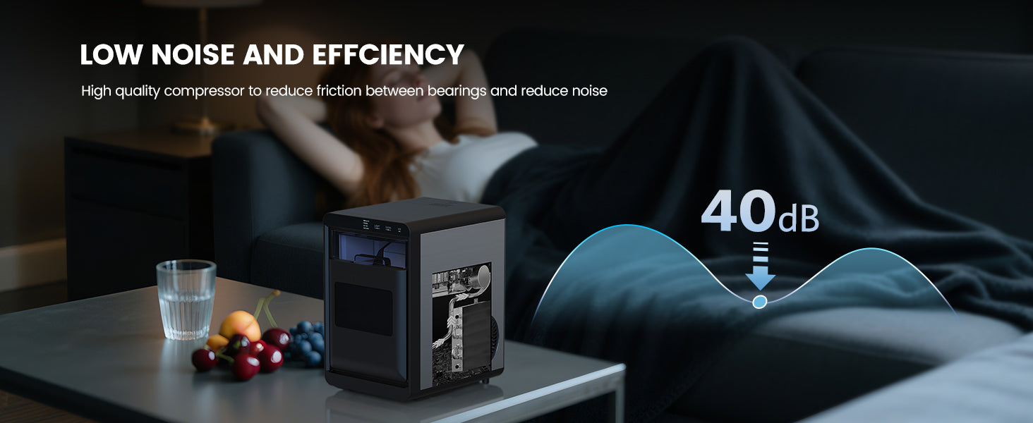 - 【Quieter Operation】: This portable ice maker is equipped with a 1.8L water tank and a powerful compressor, which can easily produce 44 pounds of ice per day. In addition, our ice maker not only has excellent cooling effect, but also has a noise level of less than 45 decibels, keep a quiet and comfortable environment.