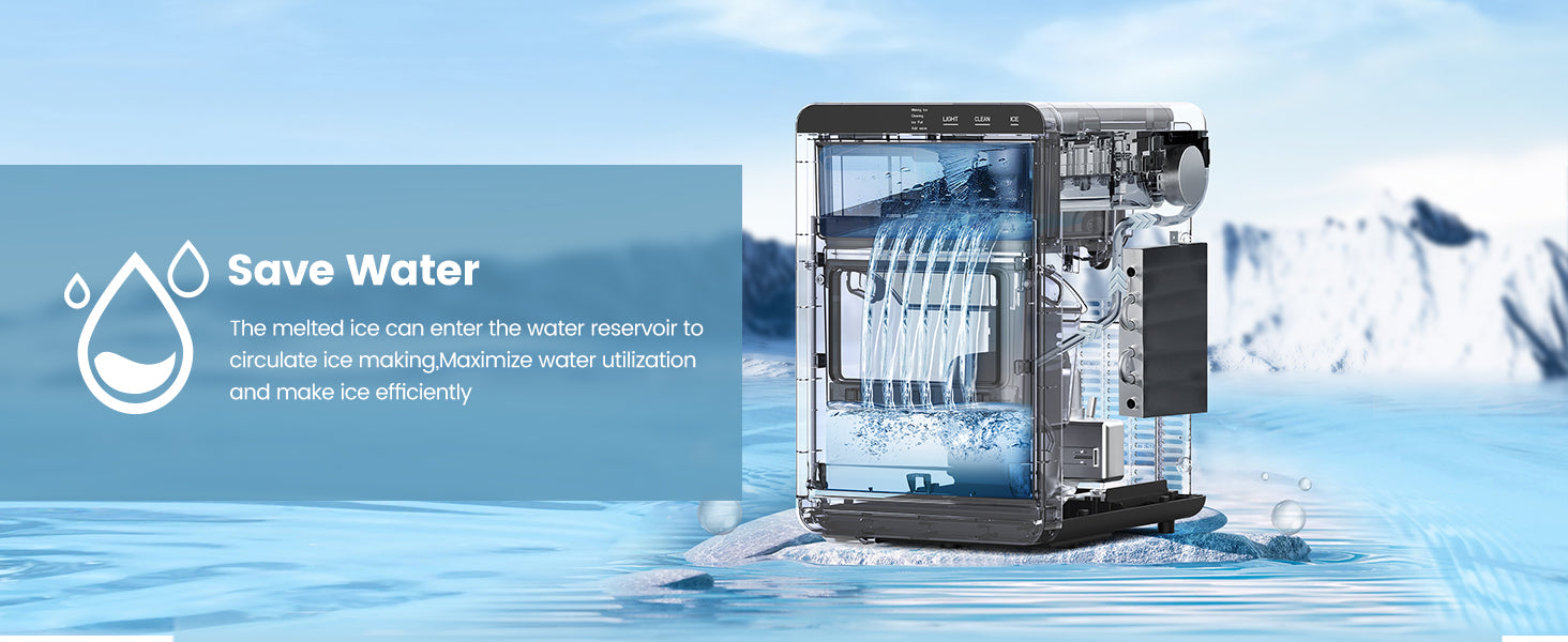 - 【Effortless Use& Self-Cleaning】: User-friendly ice maker, one-touch operation for ice making. Press the "ICE" button and the countertop ice maker will immediately start making ice. The "LIGHT" button can illuminate the inside of the ice maker, help you to see the ice-making process more clearly even in a dark environment. Press "CLEAN" for 5 seconds to automatically clean.